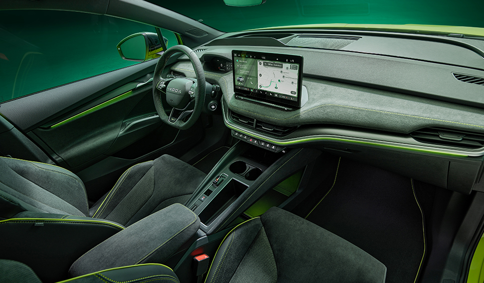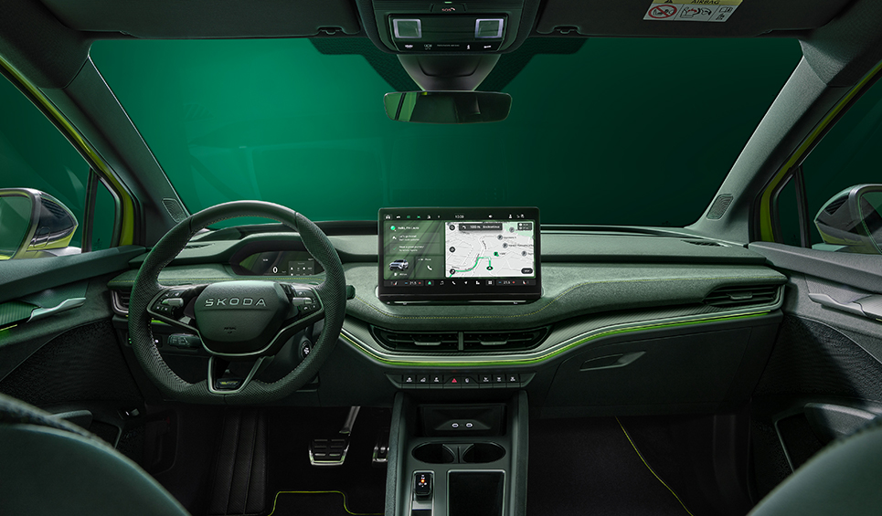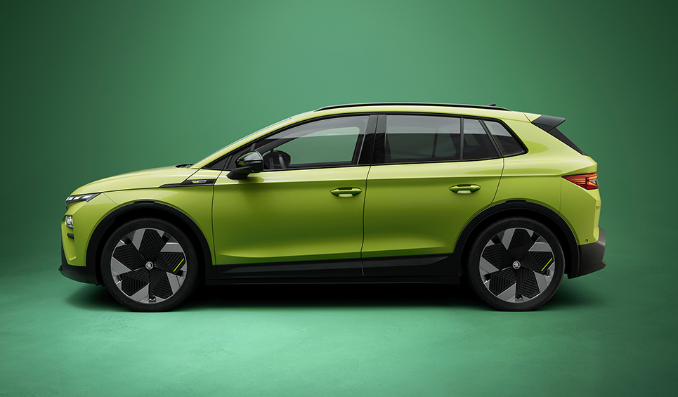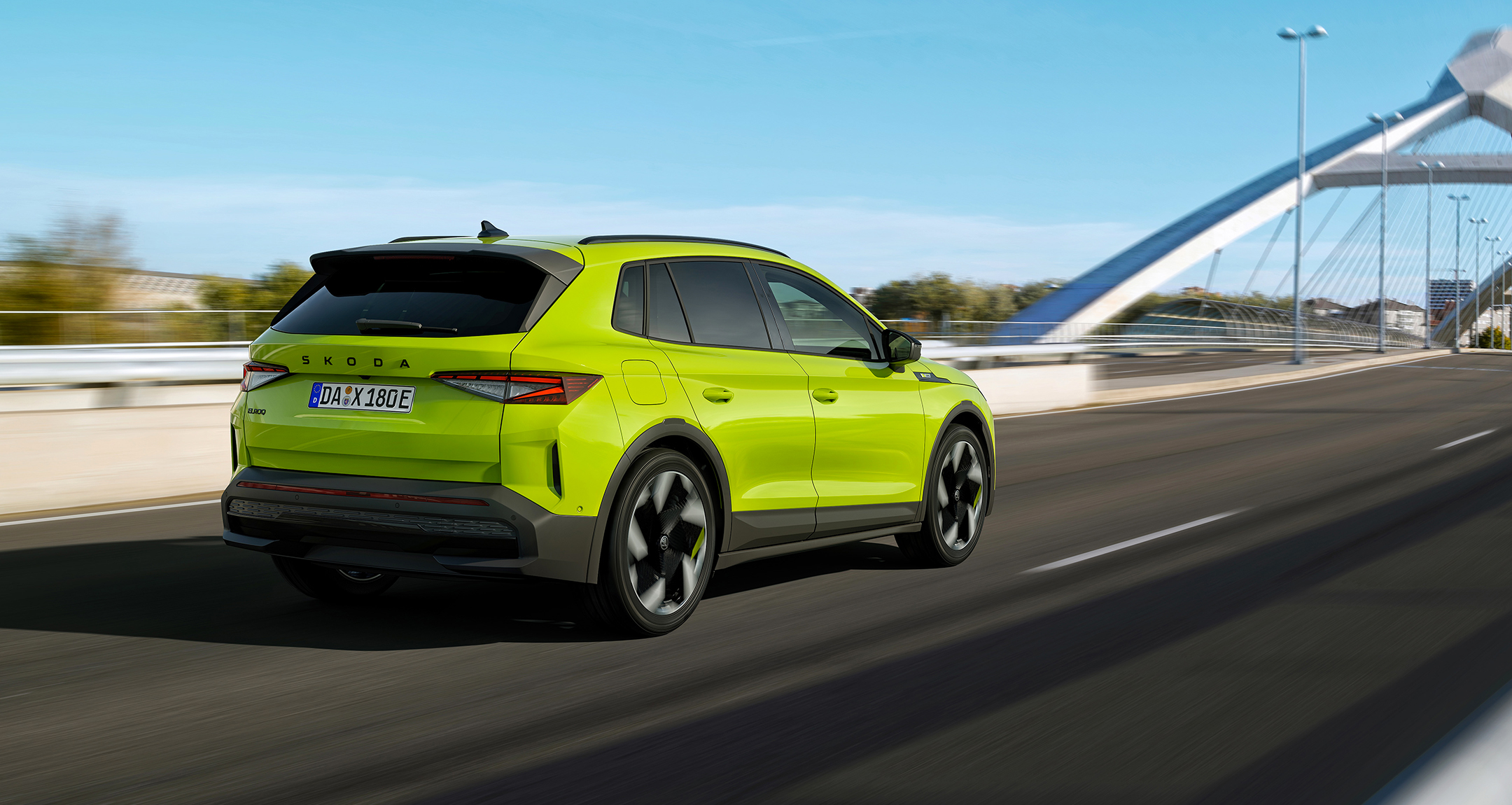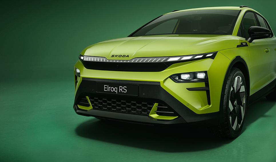 Elroq RS si okamžitě získá pozornost díky černé prosvítlené masce Tech-Deck Face. Dělené Matrix-LED přední světlomety, typické pro SUV značky Škoda, zaručují nepřehlédnutelný vzhled. Černě lakované doplňky, jako je logo Škoda na kapotě a kryty zpětných zrcátek, podtrhují ostrý, sportovně laděný design. Sportovní nárazník verze RS pak završuje přední část vozu a ještě více zdůrazňuje jeho sportovní charakter.